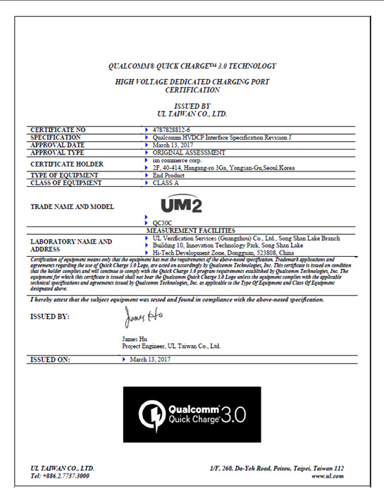 UM2 QC30C/QC30D´Â ¾à 35ºÐ ¸¸¿¡ ¹èÅ͸®¸¦ 80% ÃæÀüÇÏ´Â Ä÷ÄÄ ÄüÂ÷Áö 3.0¿¡ ´ëÀÀÇÑ´Ù. ´öºÐ¿¡ Ä÷ÄÄ ÄüÂ÷Áö 2.0À» ´ëÀÀÇÏ´Â ÃæÀü±âº¸´Ù ºü¸¥ ÃæÀüÀÌ °¡´ÉÇϸç ÀÏ¹Ý ÃæÀü°ú ºñ±³Çϸé 3¹è ÀÌ»ó ºü¸£°Ô ±â±â¸¦ ÃæÀü½ÃŲ´Ù. Ä÷ÄÄ ÄüÂ÷Áö 2.0À» ´ëÀÀÇÏ´Â ±â±âÀÇ °æ¿ì Ä÷ÄÄ ÄüÂ÷Áö 2.0 ¼öÁØÀÇ ÃæÀü ¼Óµµ¸¦ Áö¿øÇÑ´Ù.